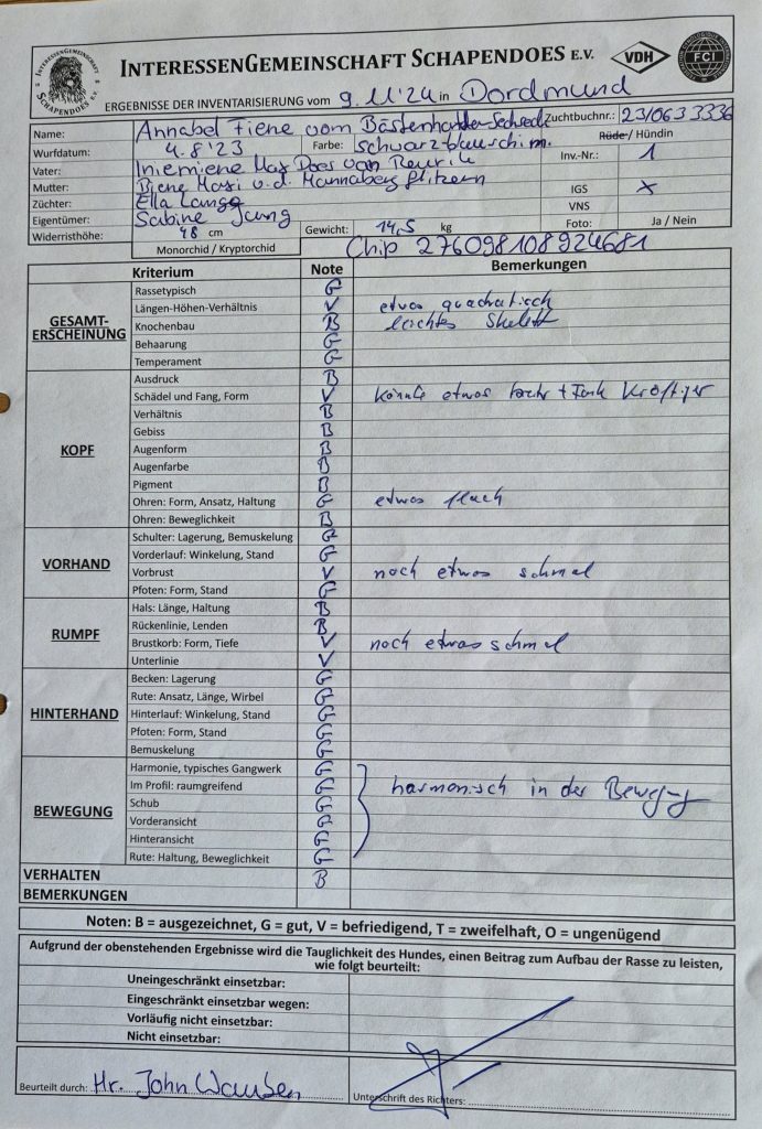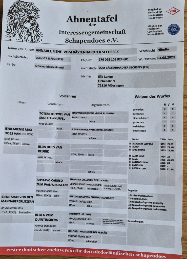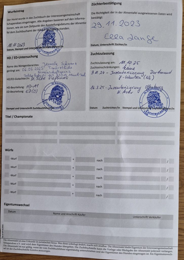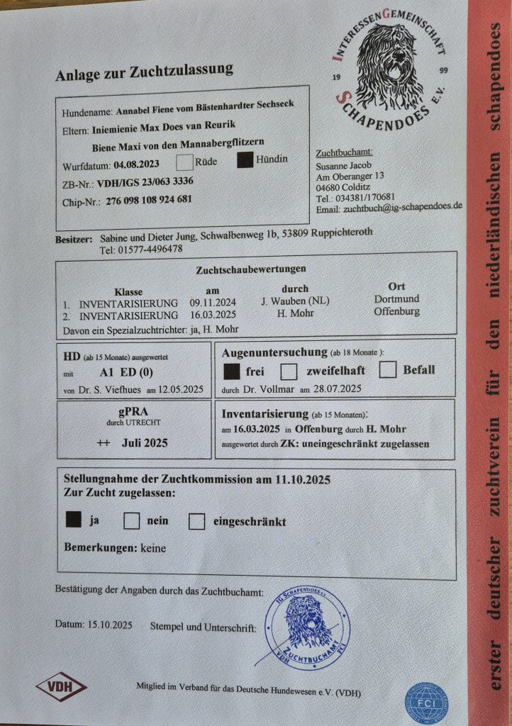 Der lange Weg zur Zuchtzulassung begann mit der ersten Ausstellung 2024 in Alsfeld und endete endlich am 11.10.2025 nach 2 Inventarisierungen, diversen Untersuchungen mit der uneingeschränkte Zuchtzulassung für Fiene. Kurz vor Weihnachten wurde dann unsere Zuchtstätte auch zugelassen.